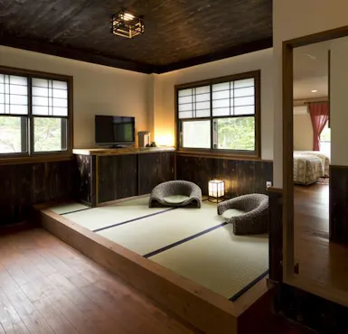 掛け流し天然温泉と料理が魅力の大人の隠れ家。山の幸、海の幸、季節の食材を使用したフレンチ料理はオーナーこだわりのワインと共に。 南欧の風情漂う本館と和風テイストの別館でゆっくりとしたひとときを。