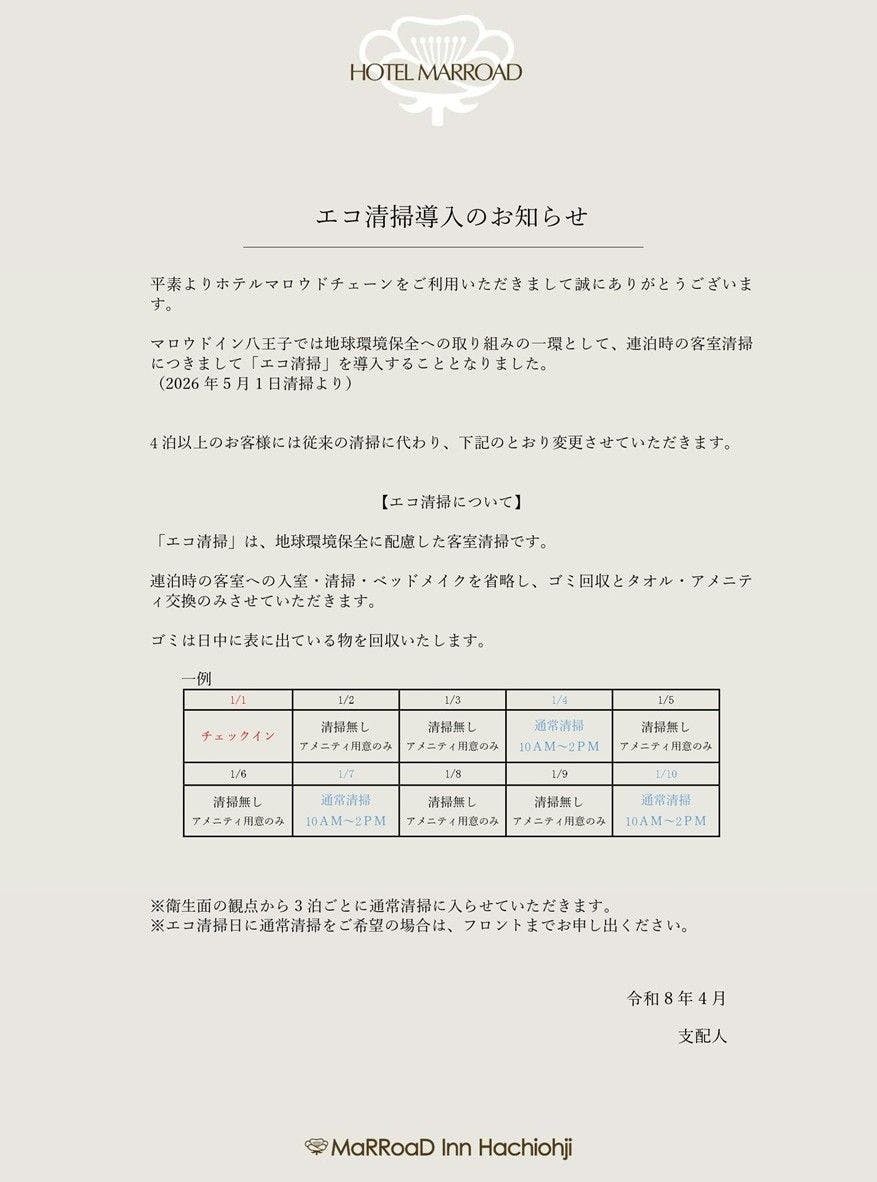 โรงแรมมารูโดอิน ฮาจิโอจิ จะเริ่มนำ “การทำความสะอาดแบบรักษ์โลก (Eco Cleaning)” มาใช้สำหรับการทำความสะอาดห้องพักในกรณีเข้าพักหลายคืนติดต่อกัน เพื่อเป็นส่วนหนึ่งของการอนุรักษ์สิ่งแวดล้อม